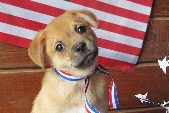Un Pom-A-Pug au pelage fauve, regardant la caméra et portant un ruban autour du cou