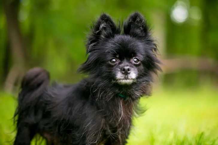 Un Pom-A-Pug regardant vers la caméra