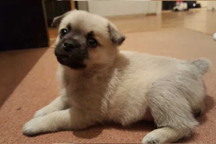 Un Pom-a-Pug allongé sur un sol recouvert d’un tapis brun