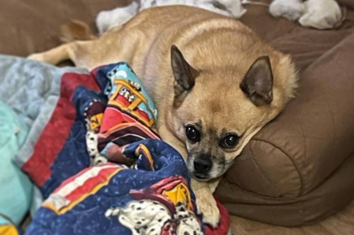 Un Pom-a-Pug allongé sur un lit pour chien avec une couverture et des peluches