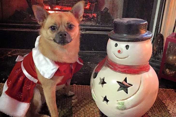 Un Pom-a-Pug portant une tenue de Noël et debout à côté d’un bonhomme de neige devant une cheminée