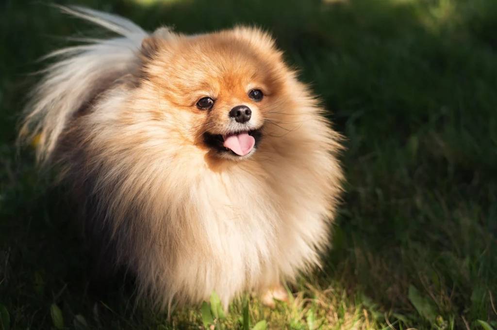 Un Pomshinese sur un terrain herbeux et tirant la langue