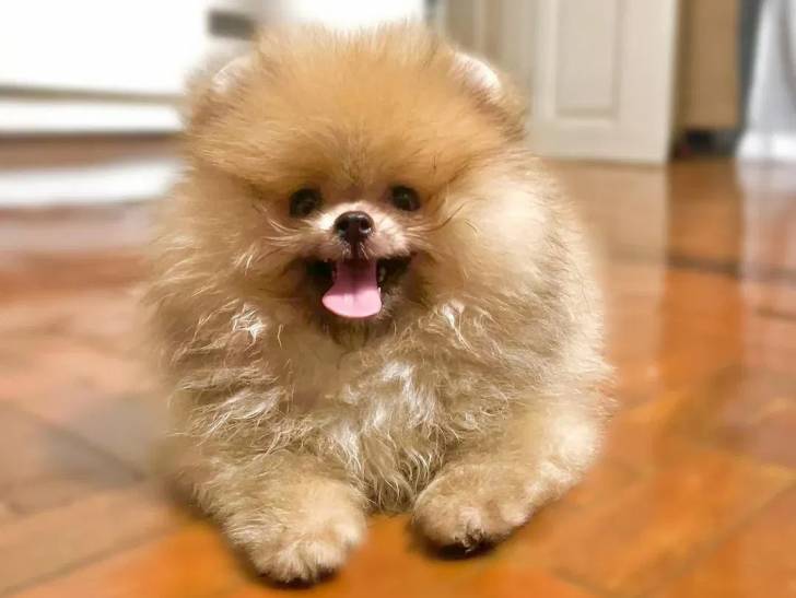 Un Pomshinese allongé sur un plancher et tirant la langue