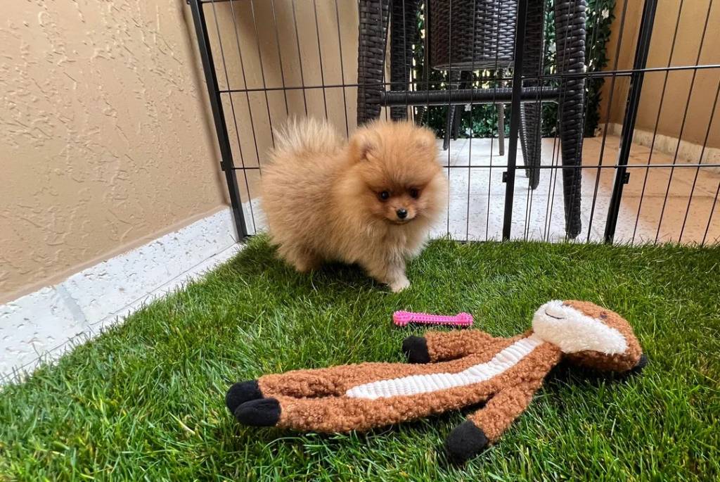 Un Pomshinese sur du gazon synthétique