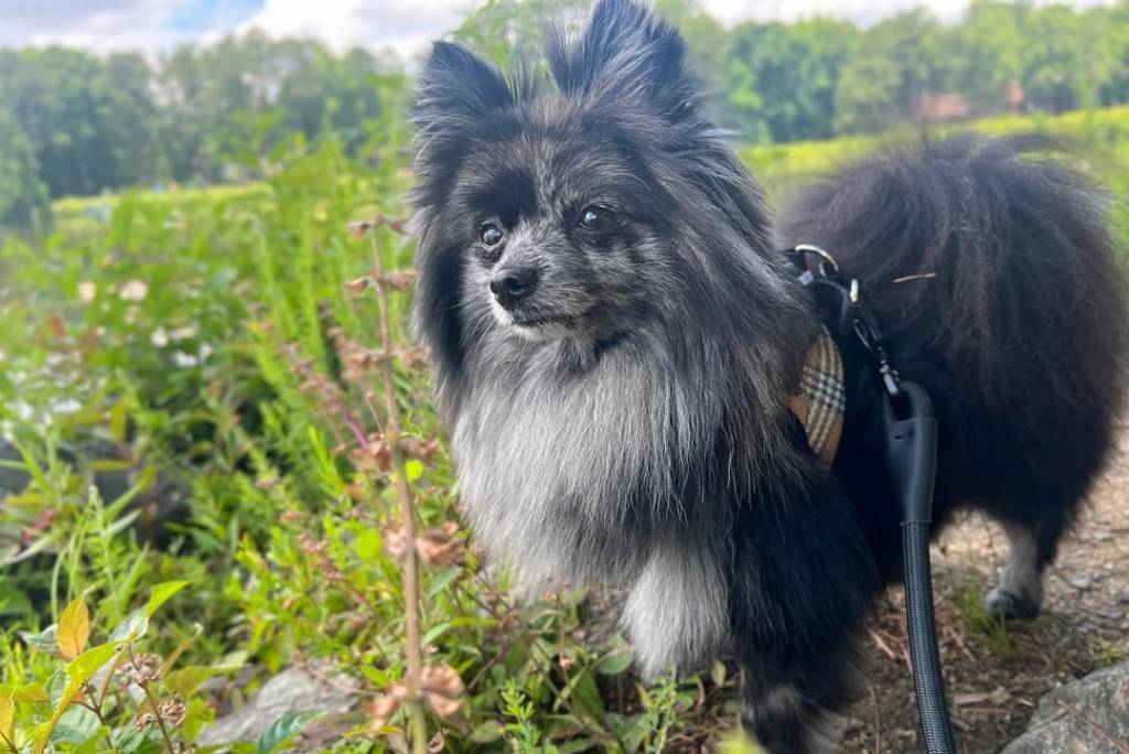 Un Pomshinese sur une surface herbacée et qui est tenu en laisse
