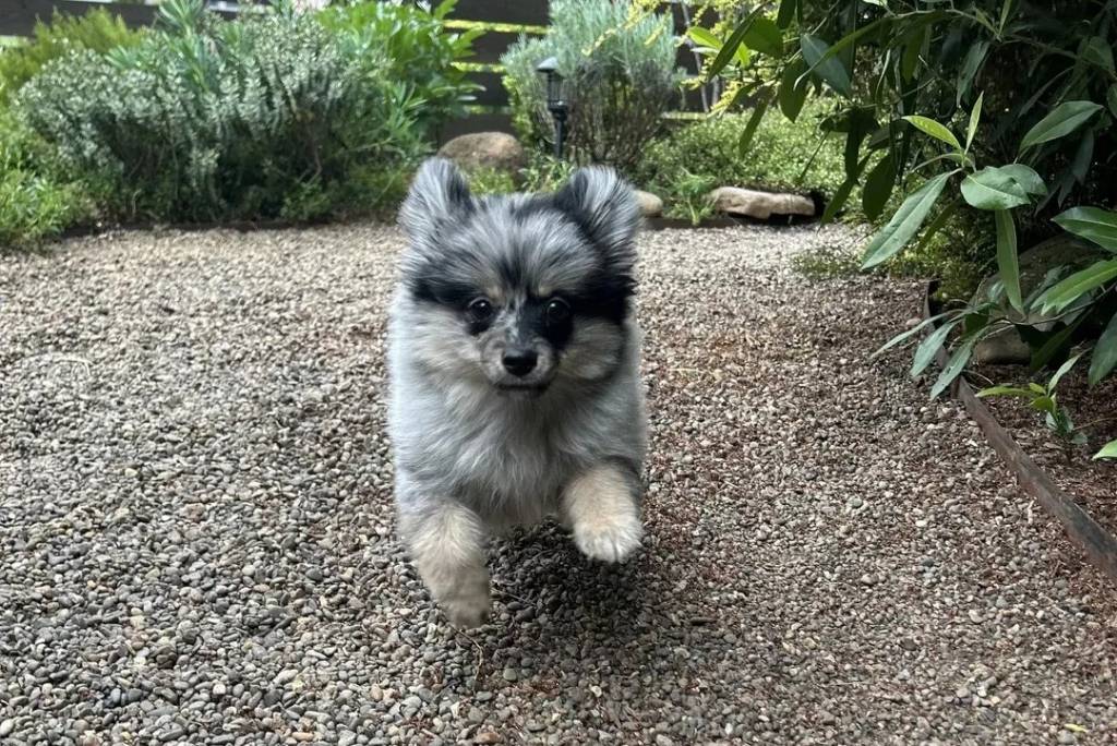 Un Pomshinese courant sur des gravillons