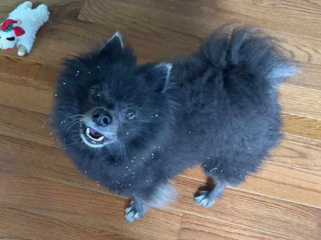 Un Pomshinese sur un plancher et regardant vers la caméra