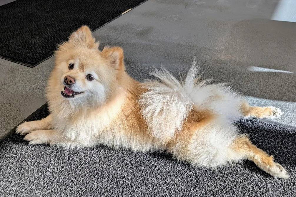Un Pomshinese allongé sur un tapis et semblant détendu