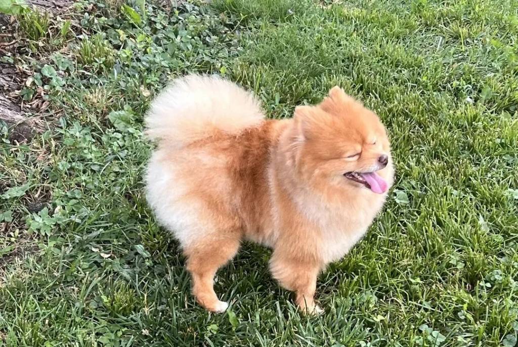 Un Pomshinese sur une surface herbacée et tirant la langue