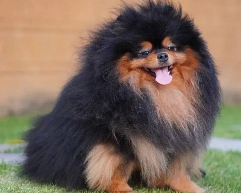 Un Pomshinese assis sur une surface gazonnée et tirant la langue