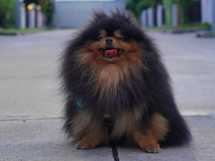 Un Pomshinese assis sur une surface bétonnée et tirant la langue