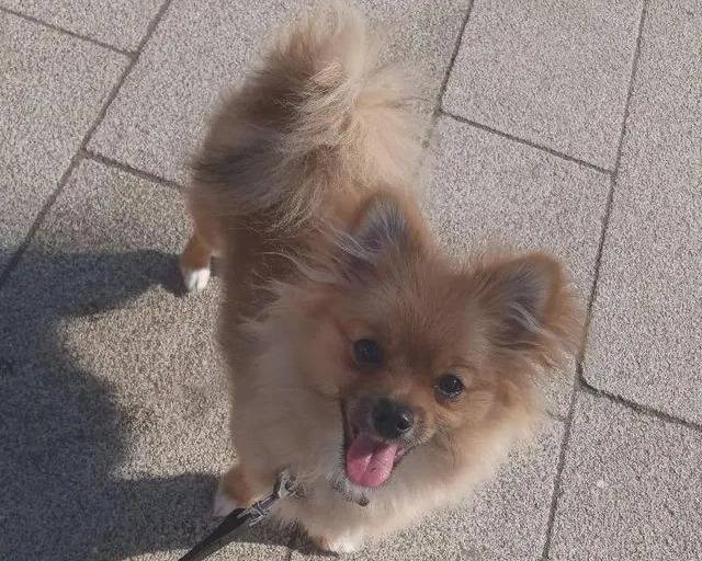 Un Pomshinese tirant la langue et qui est tenu en laisse
