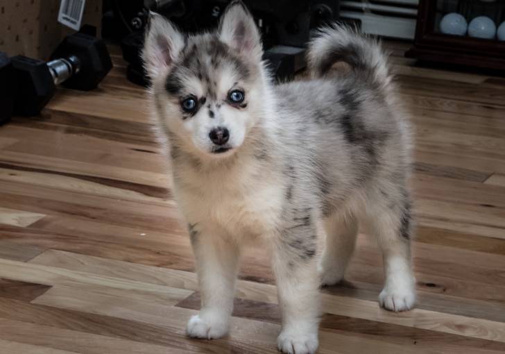 Des chiots Pomskies aux yeux bleus découvrent le monde