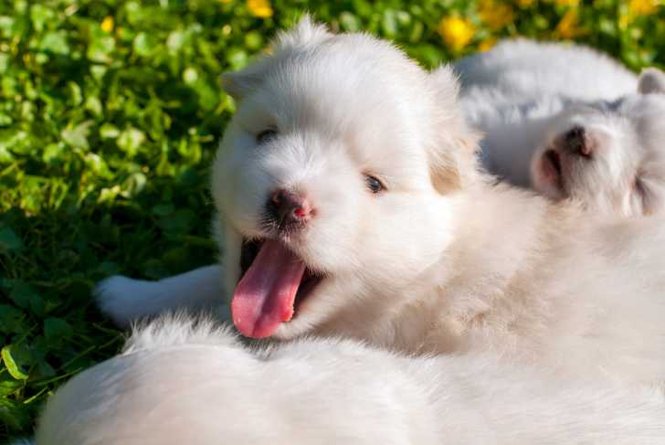 Des chiots Pomskies aux yeux bleus découvrent le monde