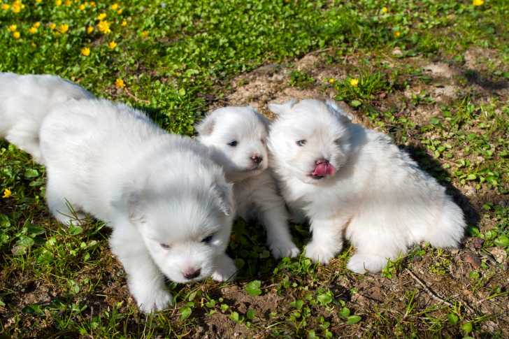 Des chiots Pomskies aux yeux bleus découvrent le monde