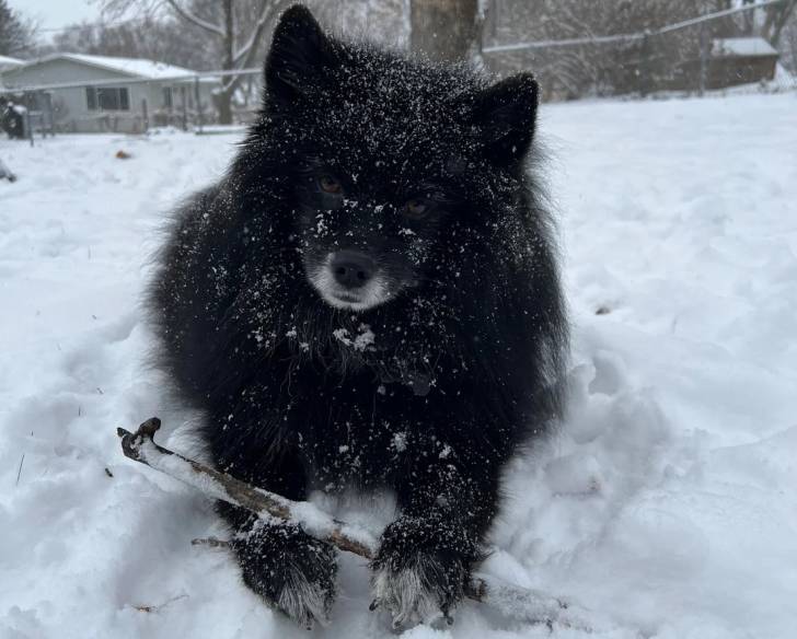 Un Pomsky allongé sur une surface enneigée et recouvert de neige