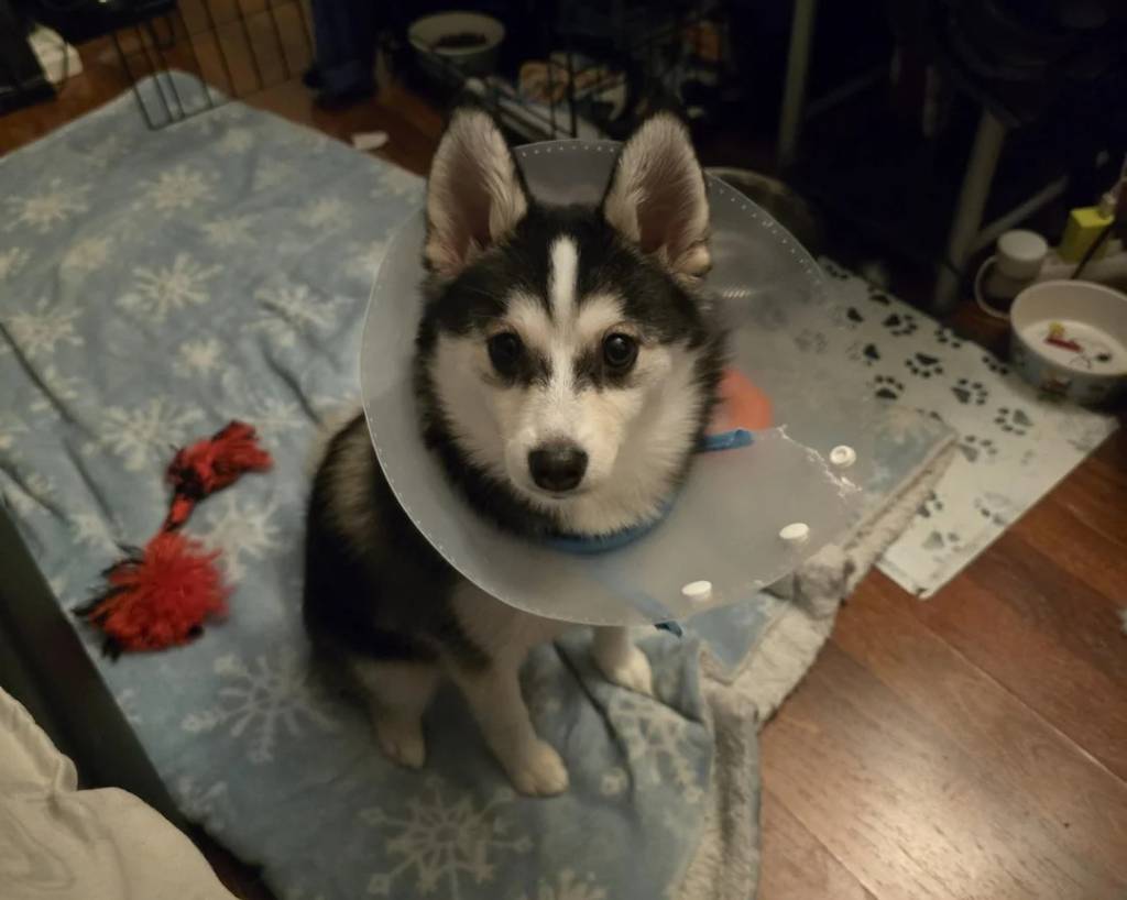 Un Pomsky assis sur un tapis et portant un carcan en plastique