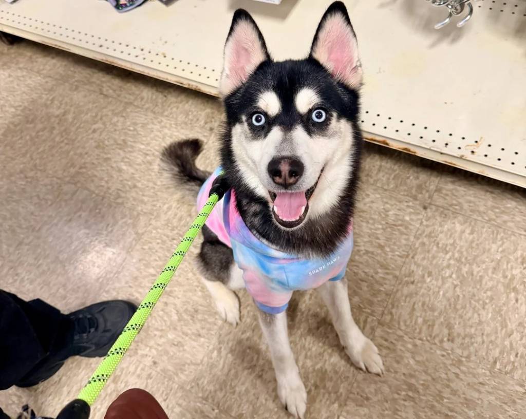 Un Pomsky ressemblant à un petit renard joue dans son panier