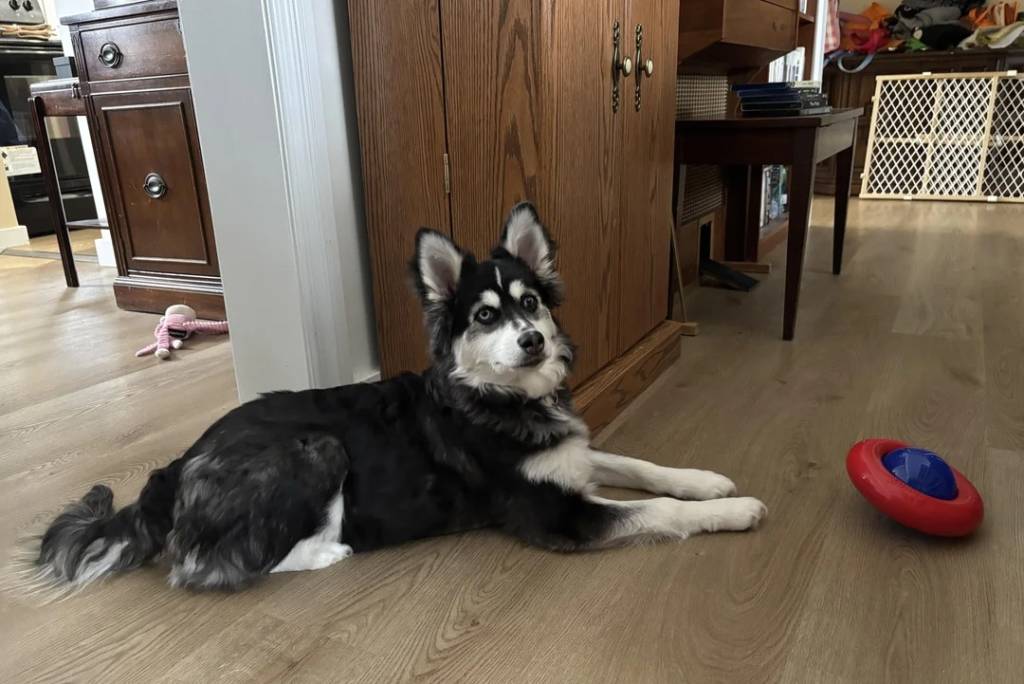 Un Pomsky allongé près d'un armoire