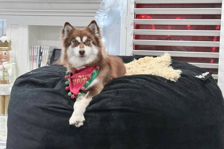 Un Pomsky ressemblant à un petit renard joue dans son panier