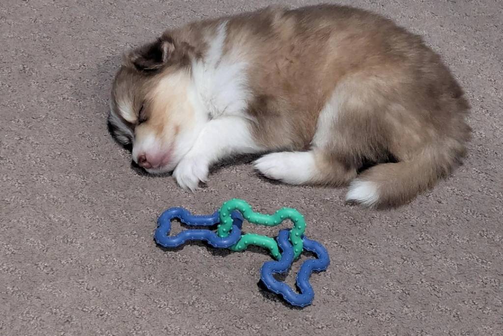 Des chiots Pomskies aux yeux bleus découvrent le monde