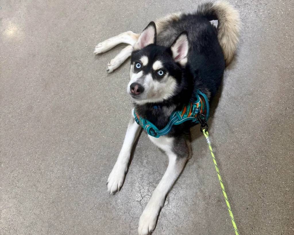 Un Pomsky allongé portant un harnais et regardant vers la caméra