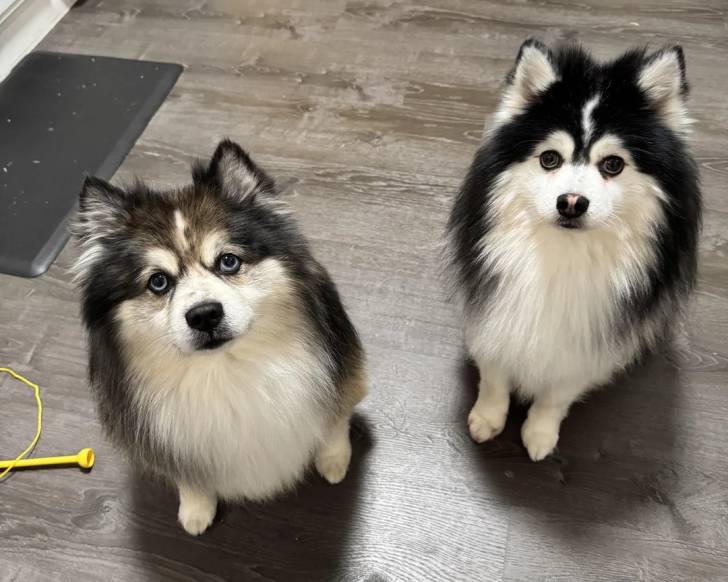 Des chiots Pomskies aux yeux bleus découvrent le monde
