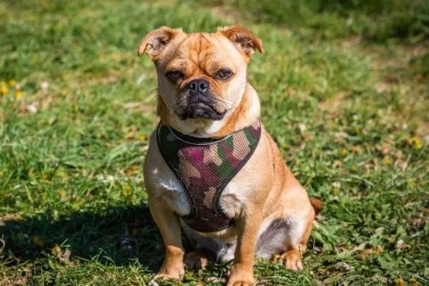 Photo d'un Porgi portant un harnais et assis sur un champ d’herbe