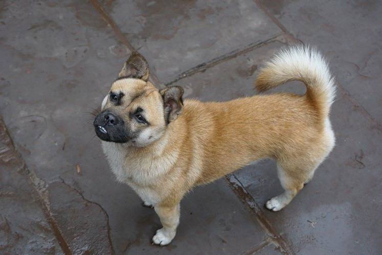 Photo prise de haut d'un Porgi debout à quatre pattes sur un pavé en pierre