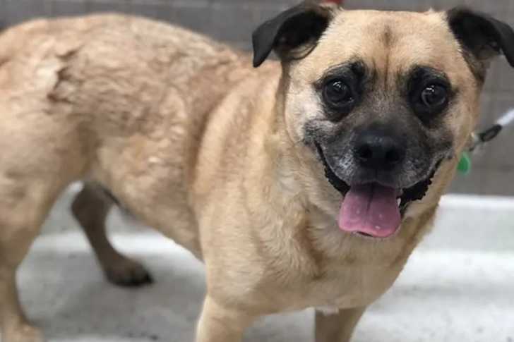Un Porgi debout sur un sol en béton avec une laisse rouge attachée à son collier