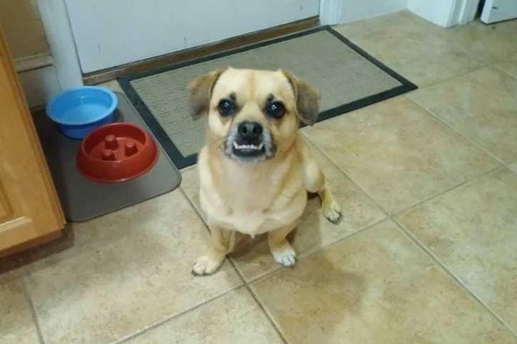 Un Porgi assis sur un sol carrelé dans une cuisine