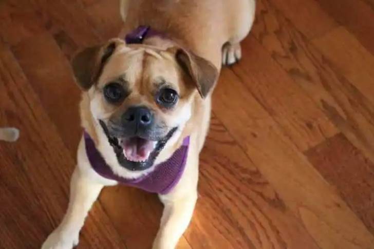 Photo prise de haut d'un Porgi allongé sur un sol en bois