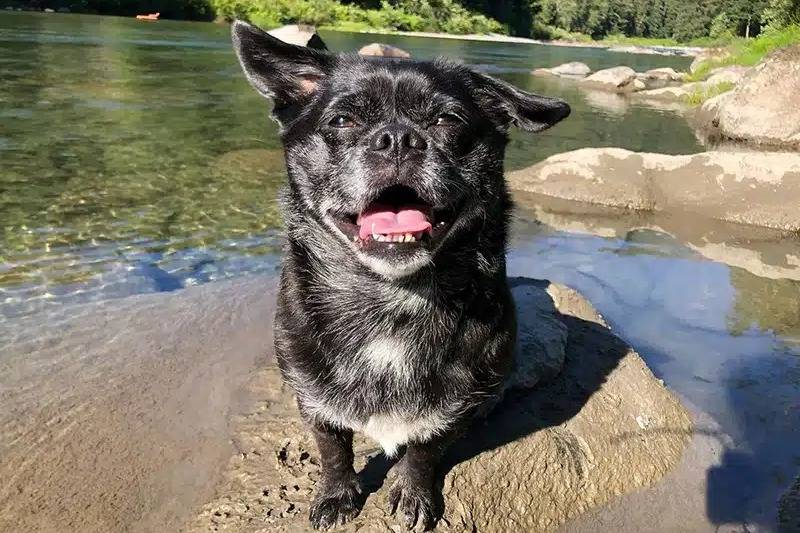 Un Porgi faisant face à la caméra et debout sur un rocher près d’une rivière