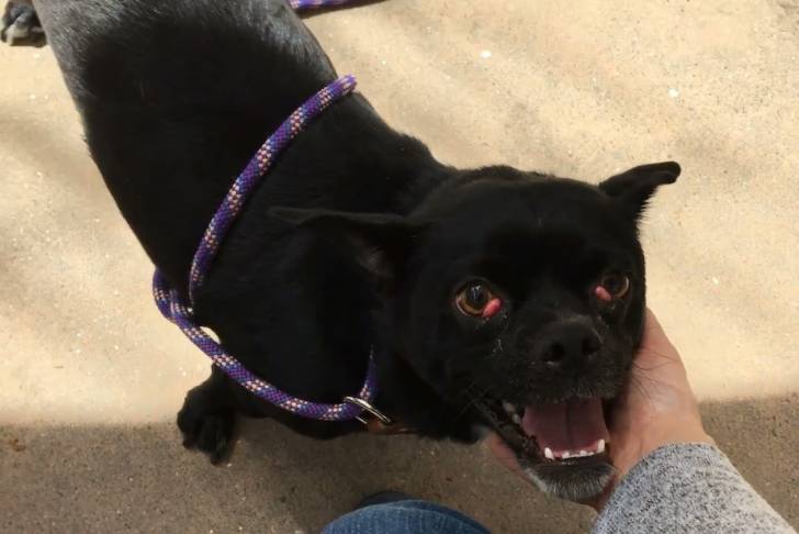 Photo prise de haut d'un Porgi noir debout sur un trottoir en béton