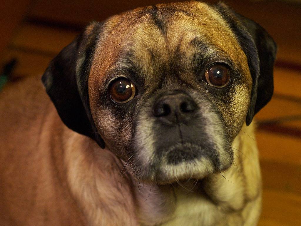 Un chiot Cocker Pug joue avec sa queue et son panier