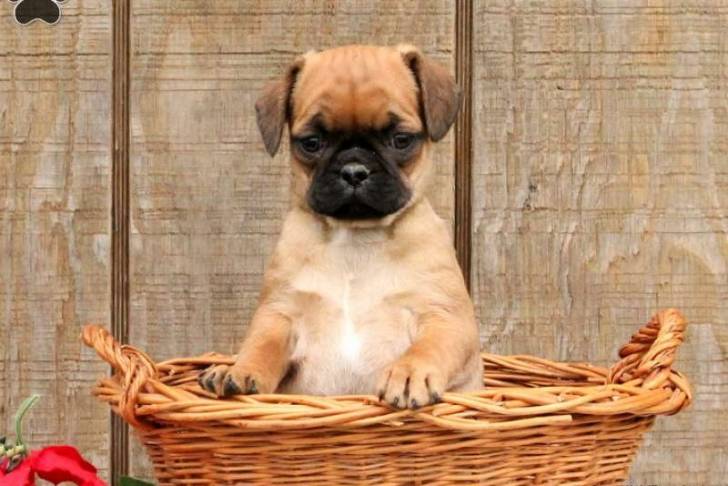 Un chiot Cocker Pug joue avec sa queue et son panier
