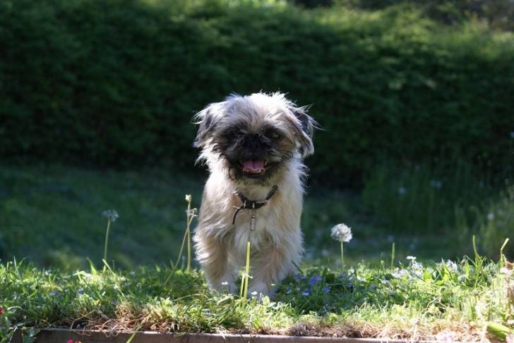 Un Pug Zu se tenant sur une parcelle d’herbe parsemée de pissenlits et d’autres fleurs sauvages