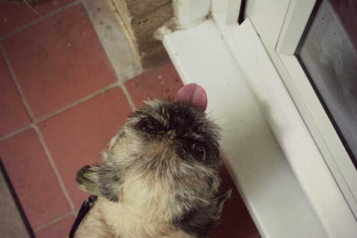 Un chien Pug Zu observe sa maîtresse préparer à manger