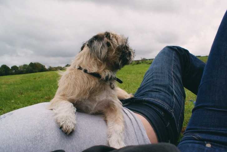 Un Pug Zu couché sur le ventre d’une personne dans un champ herbeux