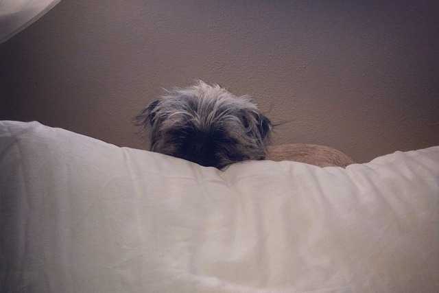 Un Pug Zu jettant un coup d’œil par-dessus le haut d’un canapé blanc