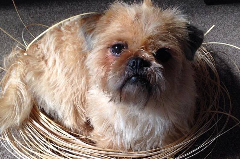Un Pug Zu dans un panier en osier sur un sol recouvert de moquette grise