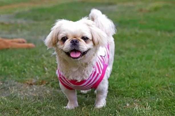 Un Pug Zu portant un pull et debout sur une pelouse verdoyante