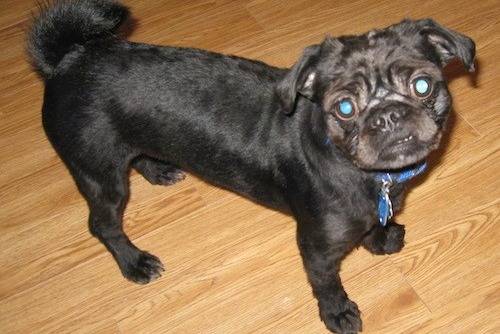 Photo prise de haut d'un Pug zu portant un collier, fixant la caméra et debout sur un plancher