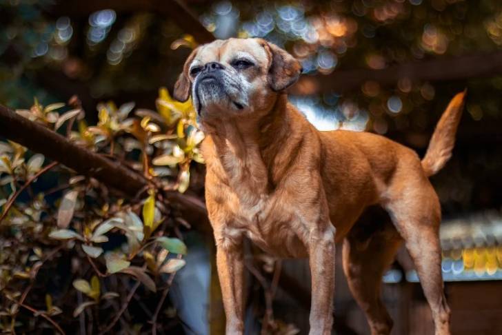 Un Pugalier se tenant à quatre pattes dans un jardin