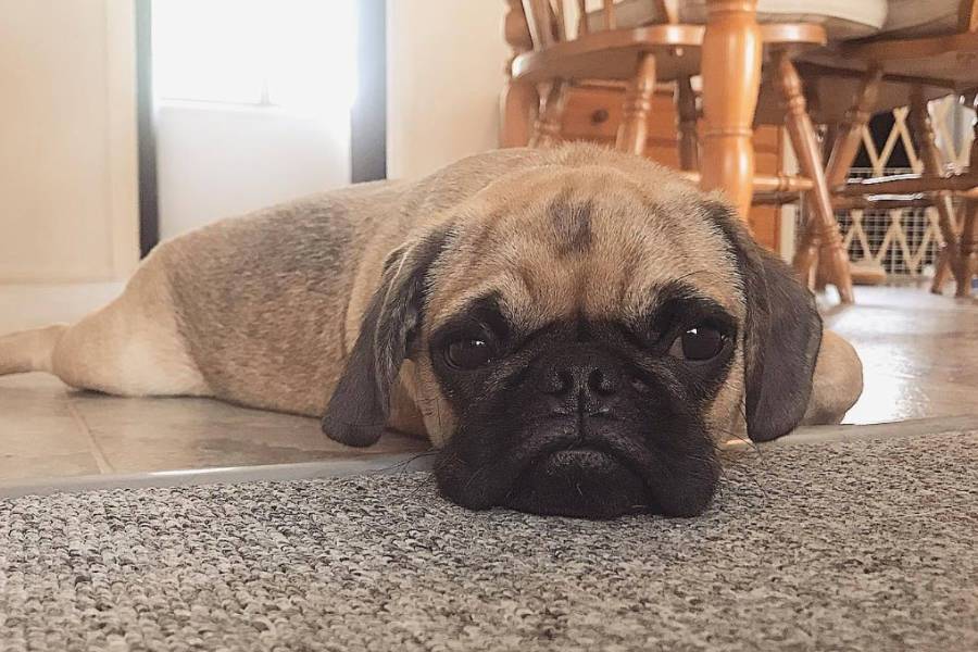 Un Pugalier allongé sur le ventre sur un tapis gris