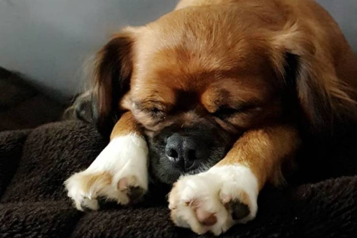 Photo d'un Pugalier dormant sur une couverture foncée