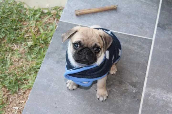 Un Pugalier assis sur un sol carrelé gris avec un carré d’herbe sur le côté gauche