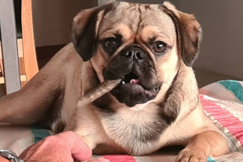 Un Pugalier allongé sur une couverture colorée.