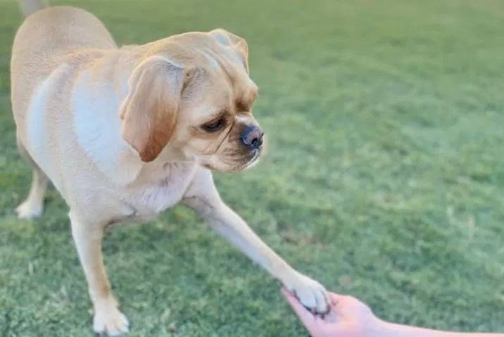 Un Pugalier debout sur l’herbe et caressé par la main d’une personne