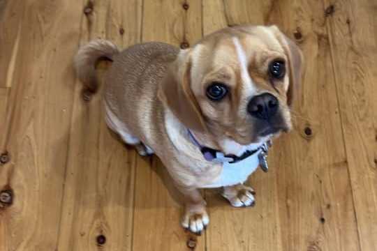 Photo prise de haut d'un Pugalier assis sur un sol en bois